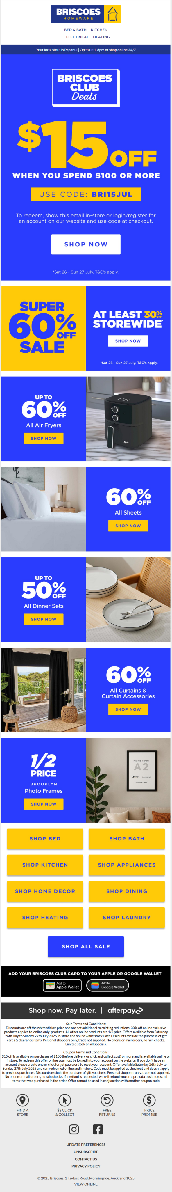 $15 off is available on purchases of $100 (before delivery or click and collect cost) or more and is available online or instore. To redeem this offer online you must be logged into your account on the website. If you don't have an account please create one or click forgot password to reset your account. Offer available Saturday 26th July to Sunday 27th July 2025 and can redeemed online and in-store. Code must be applied at checkout and doesn't apply to previous purchases. Discounts exclude the purchase of gift vouchers. Personal shoppers only, trade not supplied. No phone or mail orders, no rain checks. If a refund is requested, we will refund you on a pro rata basis across all items that was purchased in the order. Offer cannot be used in conjunction with another coupon code.
