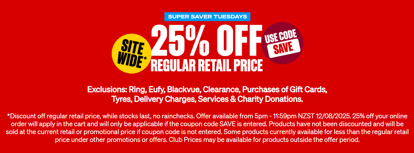 Discount off regular retail price, while stocks last, no rainchecks. Offer available from 5pm - 11:59pm NZDT 12/08/2025. 25% off your online order will apply in the cart and will only be applicable if the coupon code SAVE is entered. Products have not been discounted and will be sold at the current retail or promotional price if coupon code is not entered. Some products currently available for less than the regular retail price under other promotions or offers Club Prices may be available for products outside the offer period.