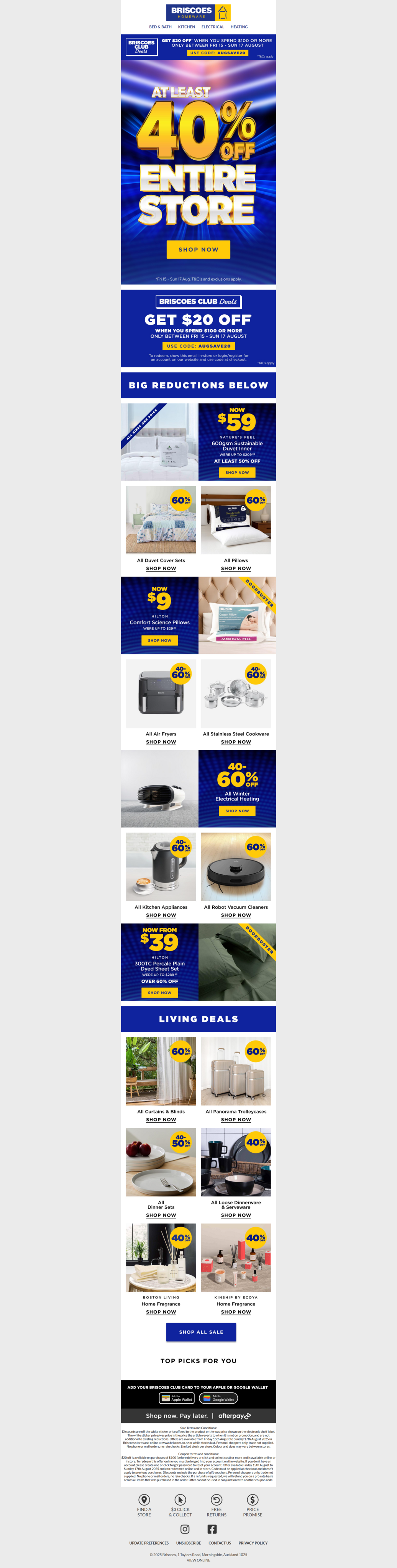 $20 off is available on purchases of $100 (before delivery or click and collect cost) or more and is available online or instore. To redeem this offer online you must be logged into your account on the website. If you don't have an account please create one or click forgot password to reset your account. Offer available Friday 15th August to Sunday 17th August 2025 and can redeemed online and in-store. Code must be applied at checkout and doesn't apply to previous purchases. Discounts exclude the purchase of gift vouchers. Personal shoppers only, trade not supplied. No phone or mail orders, no rain checks. If a refund is requested, we will refund you on a pro rata basis across all items that was purchased in the order. Offer cannot be used in conjunction with another coupon code.