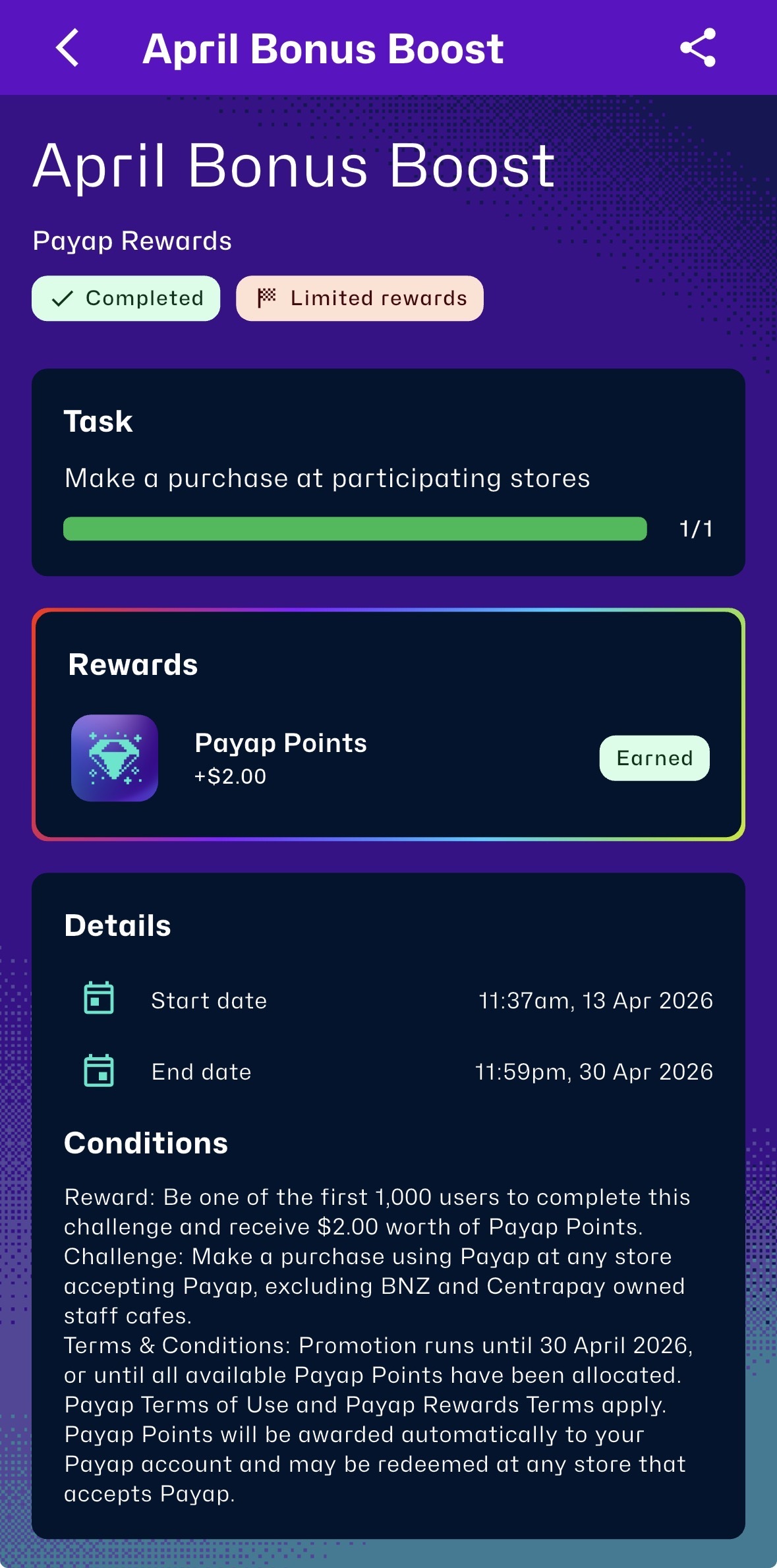 Challenge: Make a purchase using Payap at any store accepting Payap, excluding BNZ and Centrapay owned staff cafes.Terms & Conditions: Promotion runs until 30 April 2026, or until all available Payap Points have been allocated.